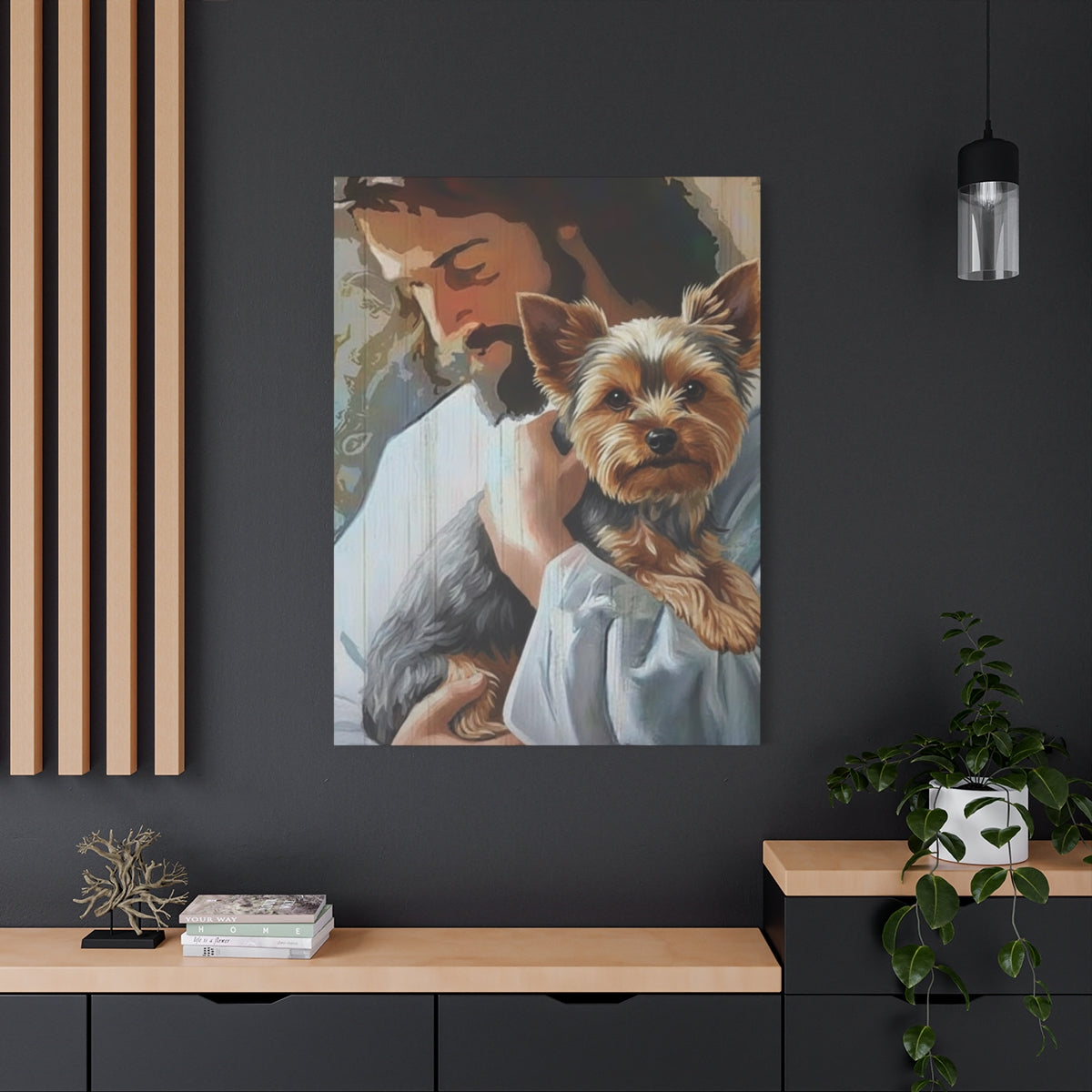 Our animals walk beside us for only a part of our lives, yet they leave pawprints on our hearts that last forever. This canvas is a tender reminder that the love we shared with them never truly fades. In this peaceful depiction of Jesus holding a beloved companion—whether a dachshund, German shepherd, yorkie, shih tzu, chihuahua, pointer, or any cherished breed—we honor the comfort, loyalty, and joy our pets brought into our days.