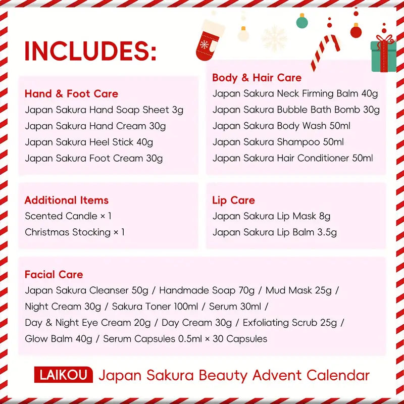 🌸 The happiness and warmth of Christmas - This Advent Calendar set includes: Japan sakura hand soap sheet, hand cream, heel stick, foot cream, neck firming balm, bubble bath bomb, body wash, shampoo, hair conditioner, scented candle, Christmas stocking, lip mask, lip balm, cleanser, handmade soap, mud mask, night cream, toner, serum, day & night eye cream, day cream, exfoliating scrub, glow balm, serum capsules